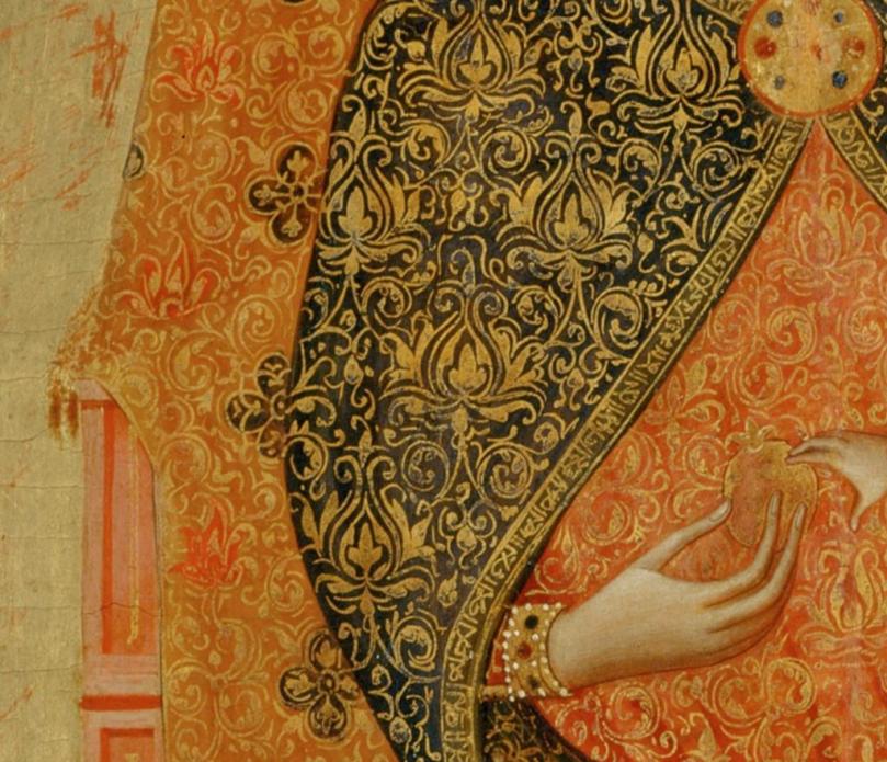 Details from Paolo Veneziano’s Virgin Mary and Child, c.1358. Pseudo-Kufic script, an imitation of the Kufic script outside of an Arabic or Islamic context, can be seen on the hems of the mantle. Also of note: Islamic influences on Western art.