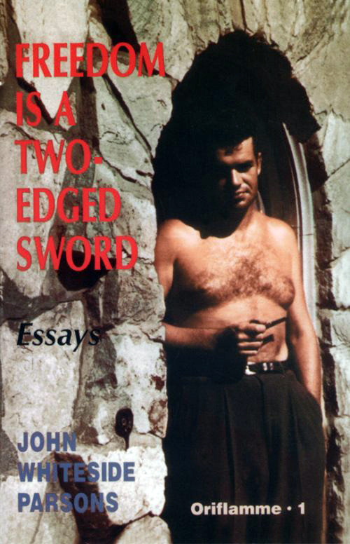 Cover to Freedom is a Two-Edged Sword by Jack Parsons (photo taken circa 1950 by unknown?, published by New Falcon Publications, 1990)